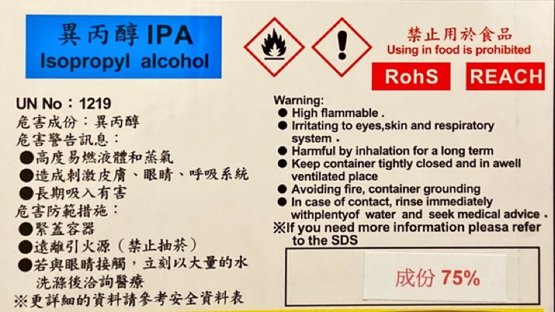 Source: uc.udn.com.tw 買時跟店員說清楚要哪種濃度就可以。 其中較易出誤會,是買錯了 75% 酒精。) 乙醇及異丙醇用來殺菌,雙氧水用來清除孢子,甘油用來護手,改用蘆薈之類也可以。 世衛沒有加入啫喱劑的有效數據,所以不建議。 至於香氣(例如加精油),世衛不建議. Include (or exclude) self posts. Search for text in self post contents. 危险性类别: 侵入途径: 健康危害: 本品为中枢神经系统抑制剂。 首先引起兴奋,随后抑制。 非生物降解性: 生物富集或生物积累性: 其它有害作用: 该物质对环境可能有危害,对水体应给予特别注意。 清洗线路板的最好方法测试 。。。。 已经测试了酒精、洗板水、异丙醇 、丙酮。 异丙醇是不是也叫异丙酮? 我买了些异丙酮清洗测试,清洗效果很好,只是会溶解电解电容上的字,阿莫有没有遇到这样的问题?